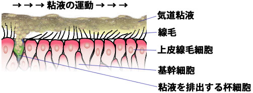 この振動には、粘液を柔らかくする力があり、線毛が正常に動作している気道では、振動によって粘液は流動化を起こし、